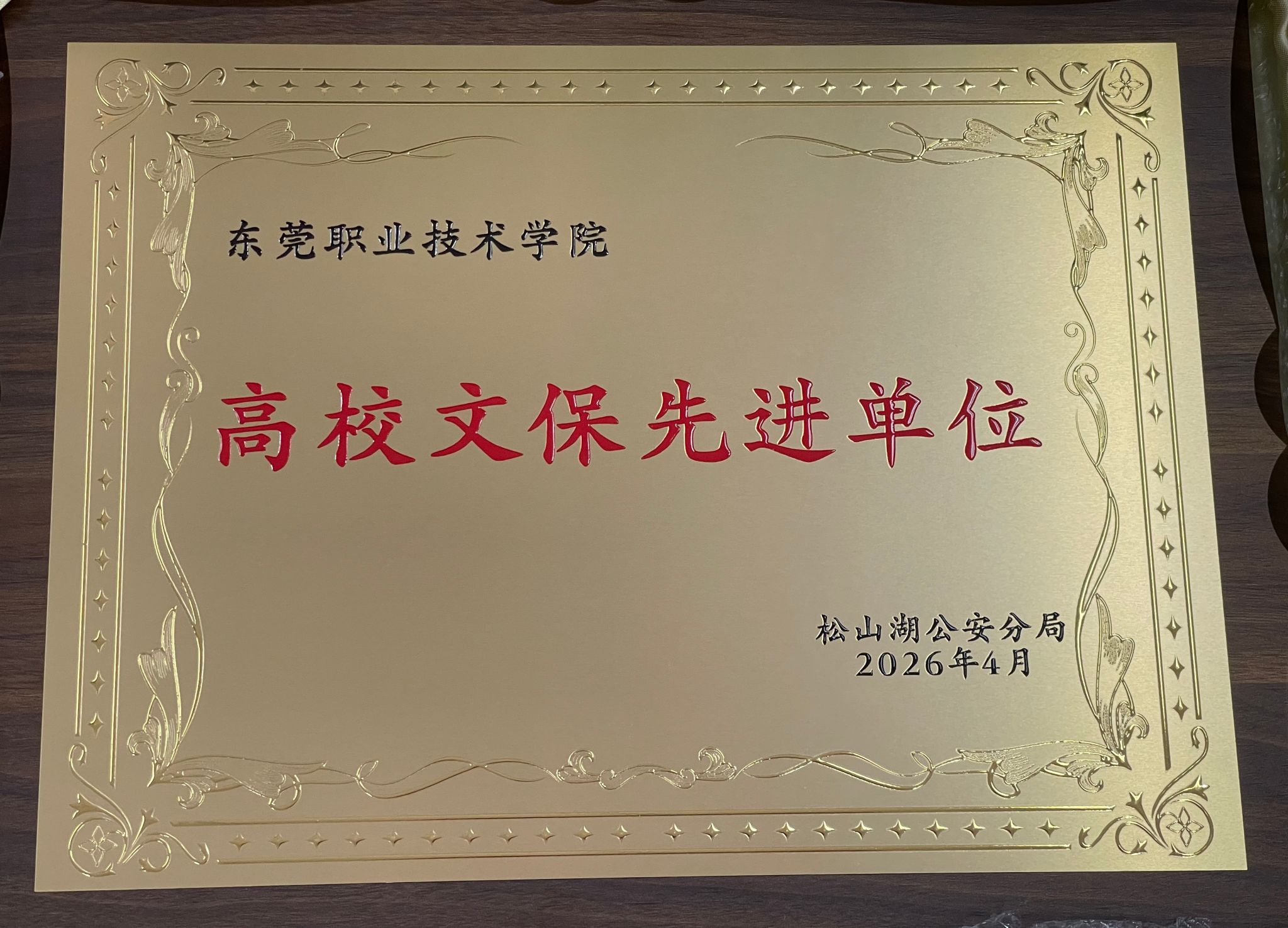 近日,东莞市公安局松山湖分局对辖区内校园文化安全工作成效突出单位予以表彰,我校因文保工作扎实有力、治理成效显著,被授予“高校文保先进单位”荣誉称号。